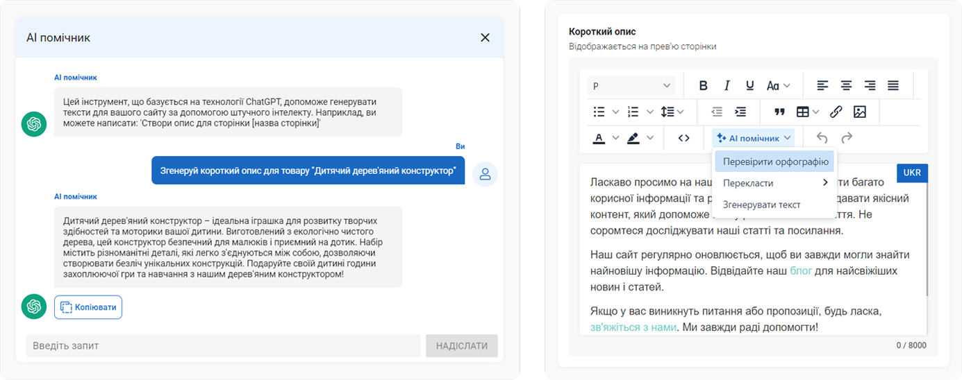 Крім того, завдяки інтеграції в адмін-панелі працює класичний чат з персональним AI-помічником, якому можна ставити будь-які питання.