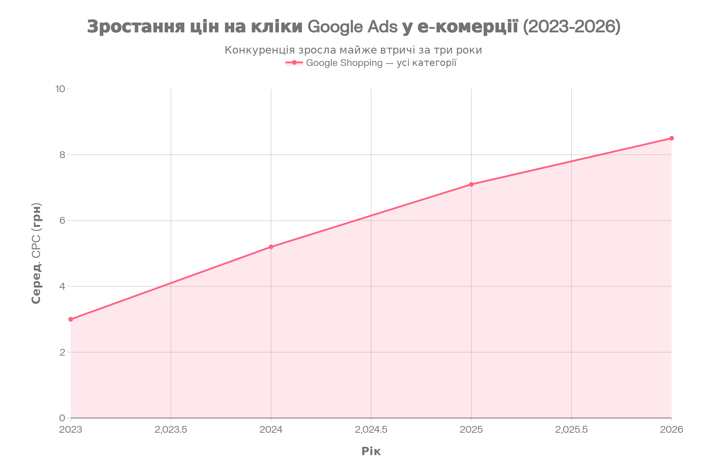 Якщо у 2023 році ціна кліку в Google Ads для е-комерції була 2-4 грн, то в 2026 вона сягає 5-12 грн залежно від ніші. В Facebook/Instagram ситуація аналогічна – ціни на кліки та покази зросли на 40-60%.