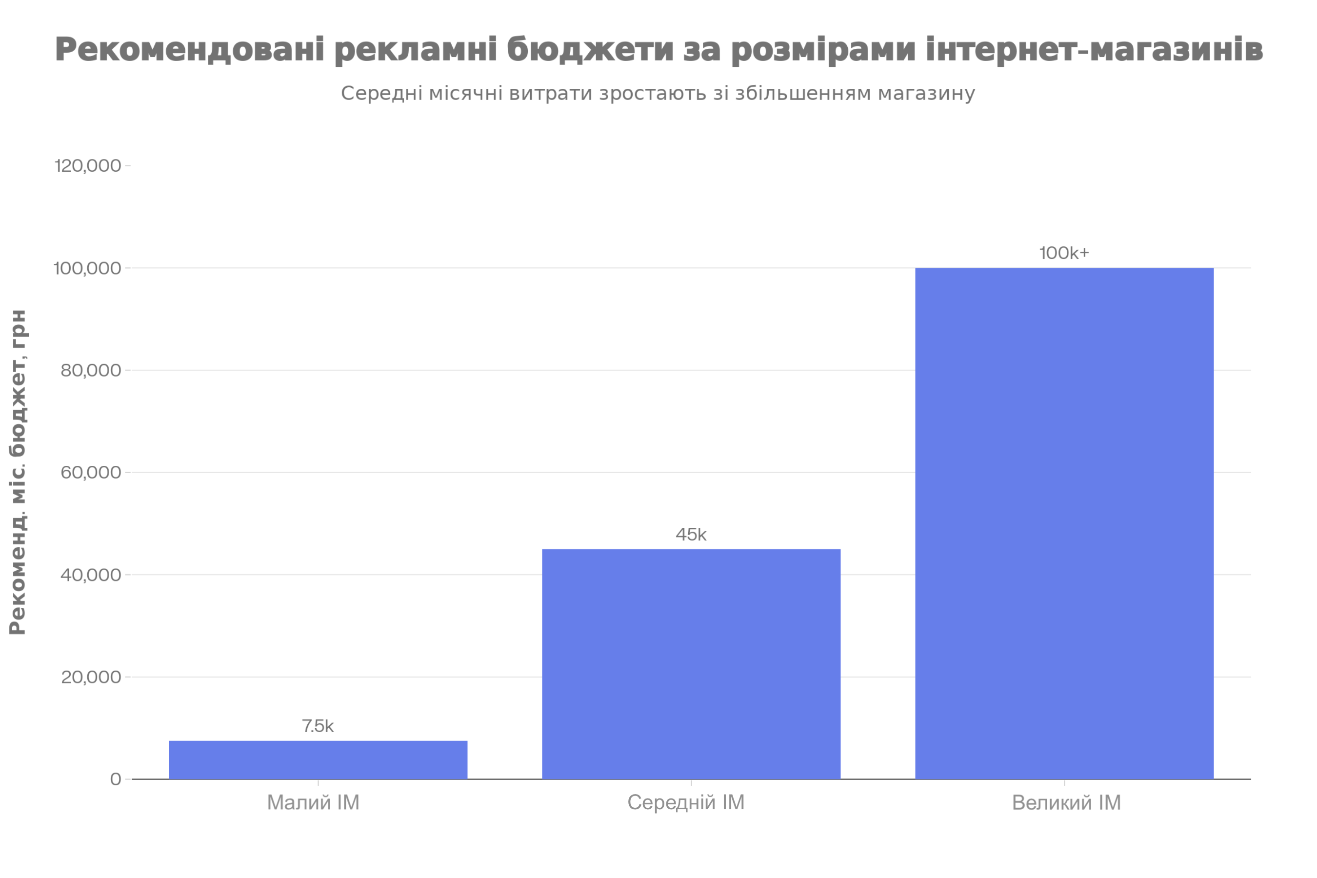 Розмір бюджету залежить від обігу, маржі, категорії товарів, гео й цільового ROAS. Але є робочі орієнтири для різних масштабів бізнесу.