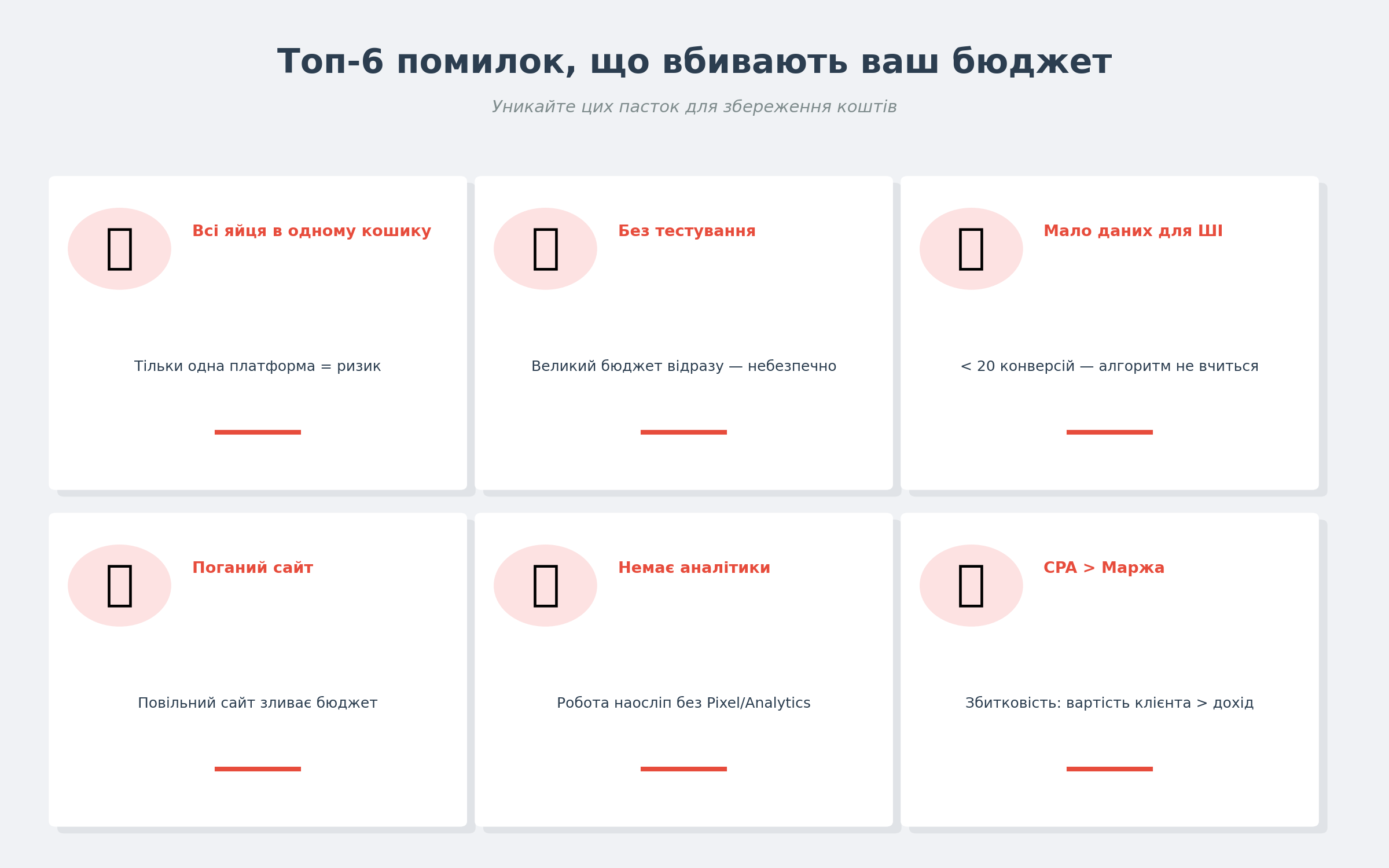 Сконцентрувати весь бюджет на одній платформі (тільки Google або тільки Facebook) – легкий шлях до провалу. Якщо платформа змінить алгоритми, ваша ефективність впаде.