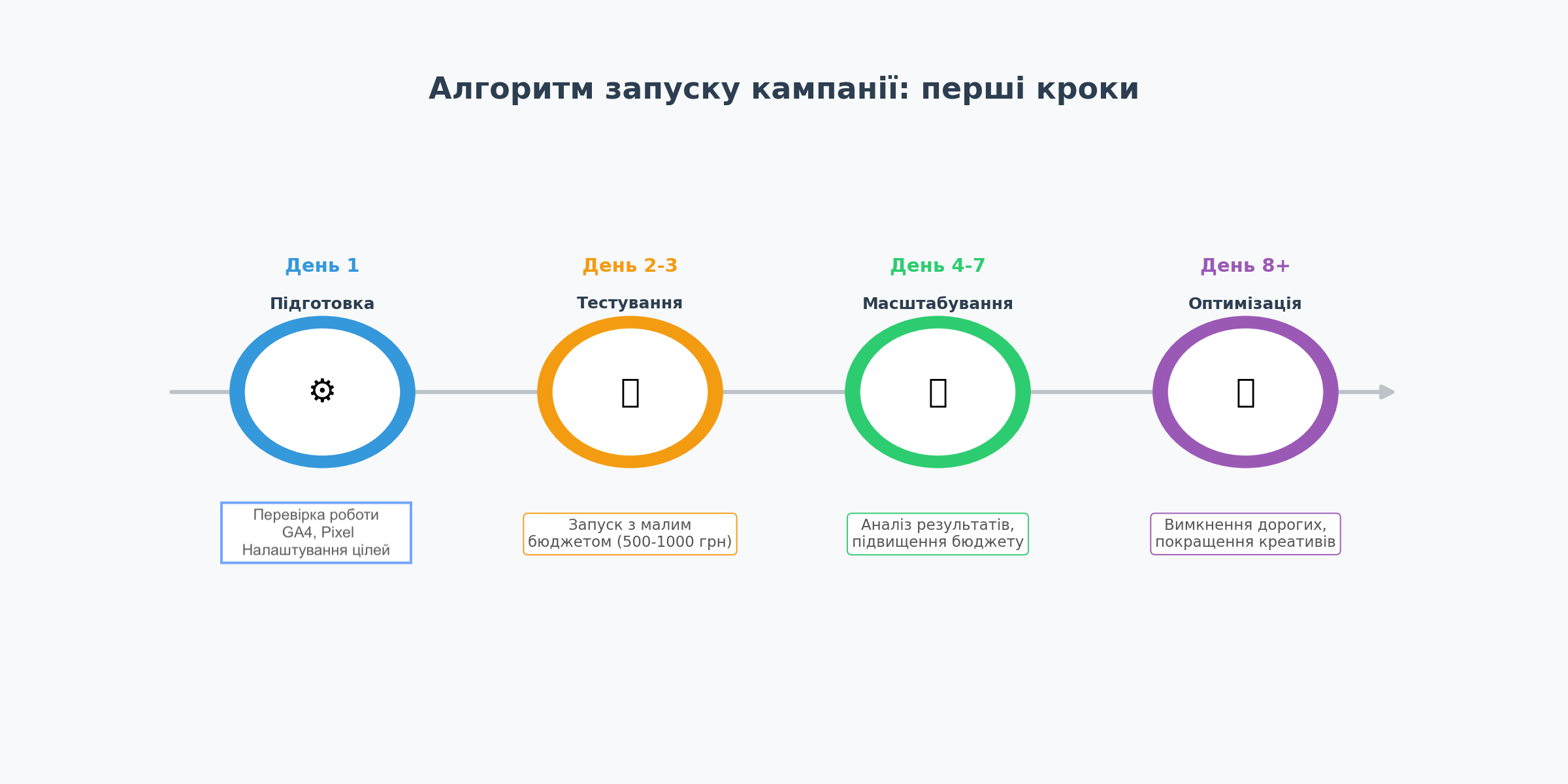 Запустити кампанію на максимальний бюджет без попереднього тестування – це як стрибати з моста, сподіваючись на ліжко знизу. Почніть з малих витрат (500-1000 грн), протестуйте, проаналізуйте результати та масштабуйте ефективні зв’язки оголошень, креативів, аудиторій та ключових слів.