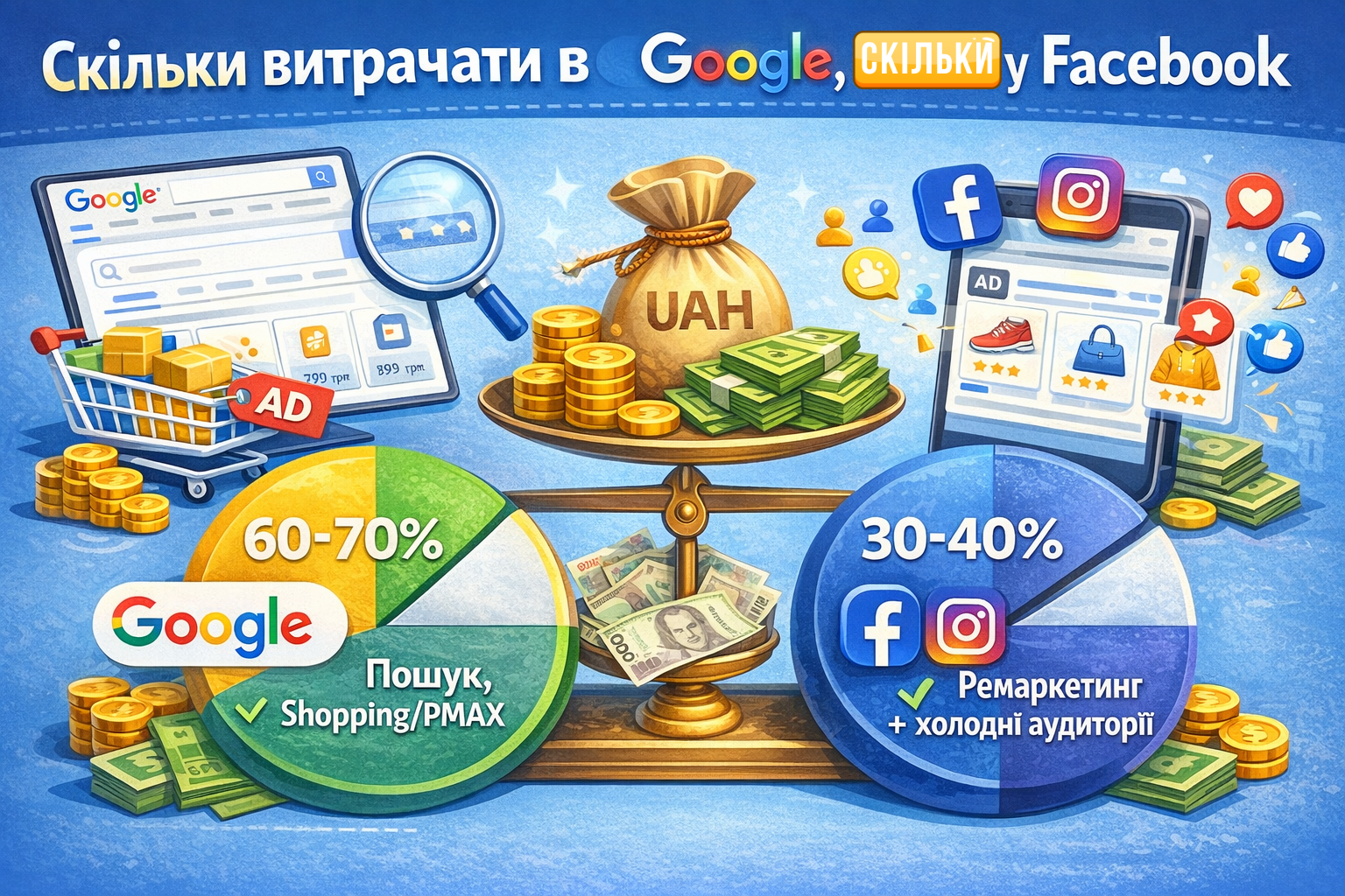Для більшості інтернет-магазинів схема така: Google приносить «гарячий» попит (люди вже щось шукають), а Facebook/Instagram допомагають формувати або підігрівати попит, підтримують бренд і працюють із ремаркетингом. Тому частка бюджету зазвичай зміщується в бік Google, а Meta працює як підтримуючий або масштабуючий канал.