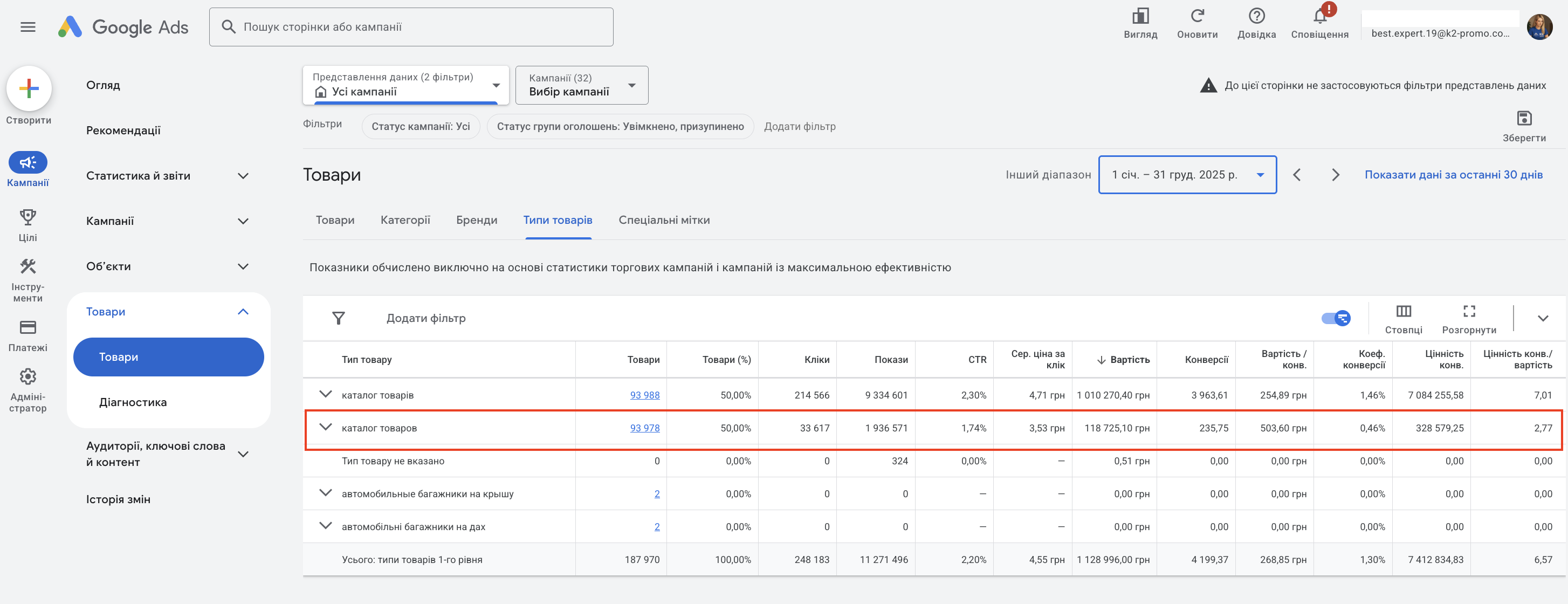 ефективність на рівні кампанії, групи обʼєктів, категорії та окремих товарів;