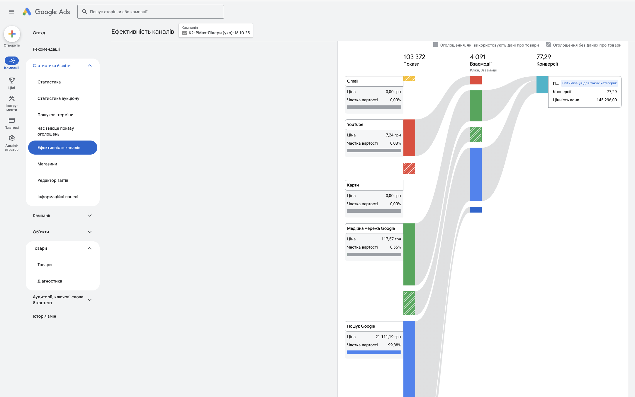 звіт «Ефективність каналів», щоб оцінити, як кожен канал (PMax, Search, локальні кампанії) впливає на загальний дохід бізнесу.