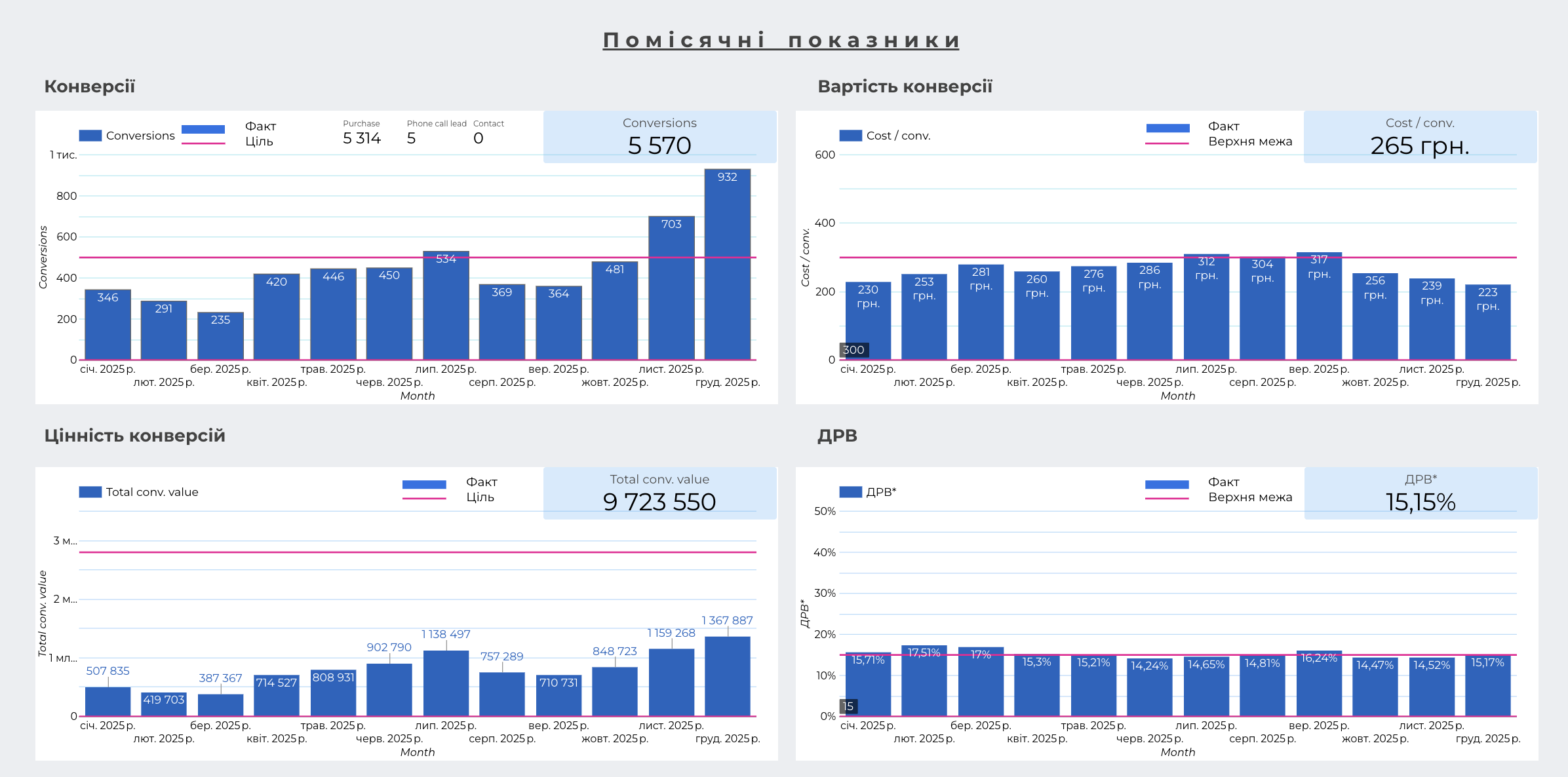 Цінність конверсій збільшилася з близько 507 тис. грн на початку року до 1,36 млн грн у грудні, при цьому зберігався цільовий рівень ДРВ.