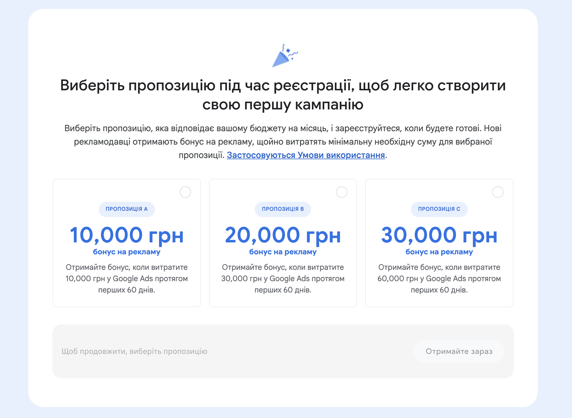 Перш ніж натиснути кнопку реєстрації, ви маєте знати про бонус від Google. Система активно підтримує нових рекламодавців в Україні, пропонуючи спеціальні купони на рекламу. Залежно від поточної програми, ви можете отримати 10 000, 30 000 або навіть 60 000 гривень на бонусний рахунок.
