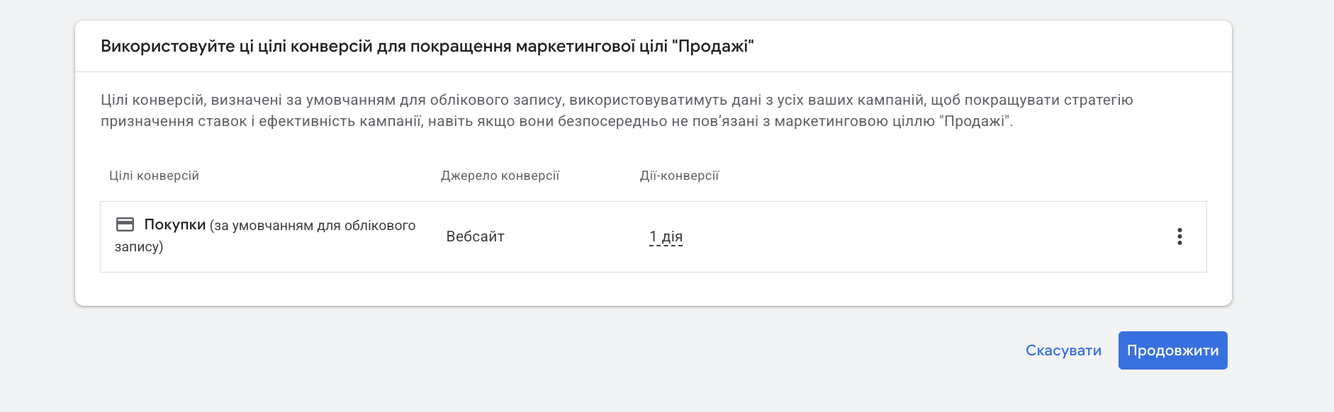 Наступний крок є дуже важливим. Оскільки алгоритми використовують обрані цілі для оптимізації рекламної кампанії, важливо зосередитись саме на цінних для вашого бізнесу конверсіях. Для більшості інтернет-магазинів можна обрати Покупки. Якщо ж отримуєте значну кількість заявок по дзвінкам, додайте в оптимізацію Дзвінки.