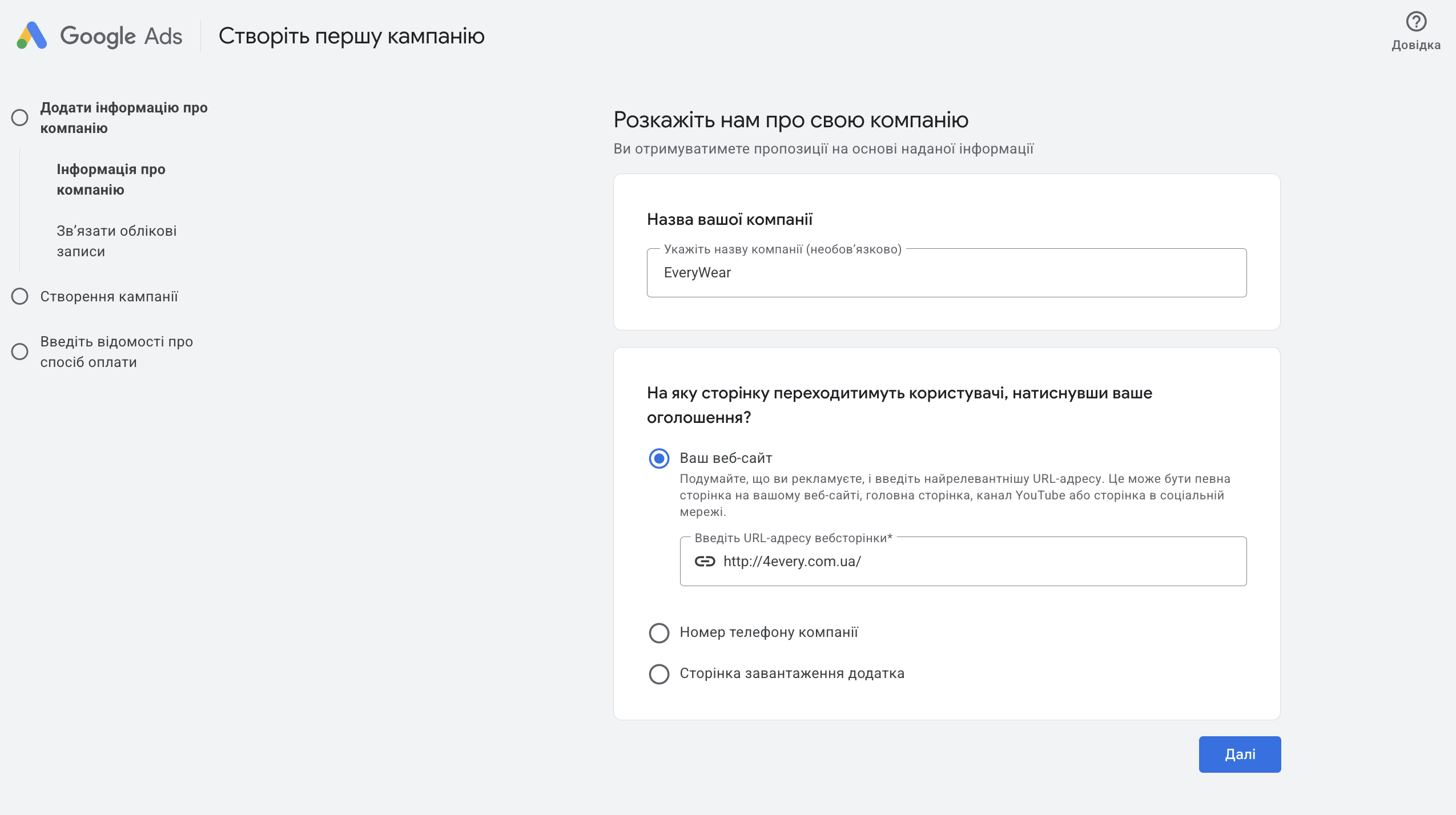 Коли ви вперше заходите на головну сторінку Google Ads і натискаєте “Почати”, система пропонує ввести дані про компанію та посилання на посадкову сторінку, на яку плануємо вести користувача.