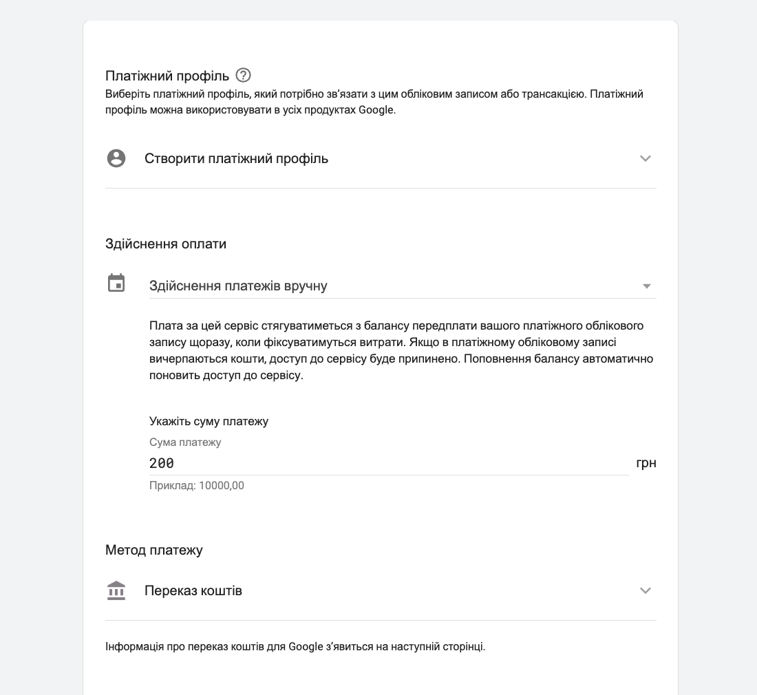 Як і в нашому прикладі, іноді система збоїть і не дає обрати необхідний Тип рахунку: ми планували зазначити “Фізична особа”, але підтягується лише “Організація”. В такому разі необхідно обрати будь-який доступний варіант і пізніше виконати зміну платіжного профілю через запит в підтримку.