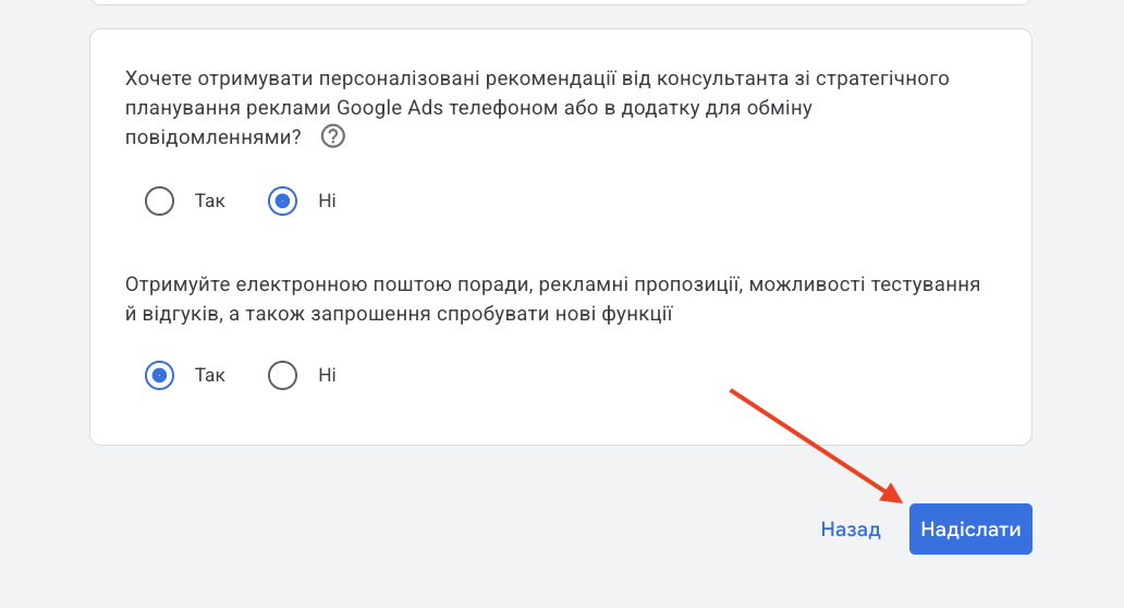 Після введення даних натисніть “Надіслати”. В більшості випадків після цього рекламний кабінет створено і тепер ви готові до справжньої магії — створення своєї першої кампанії.