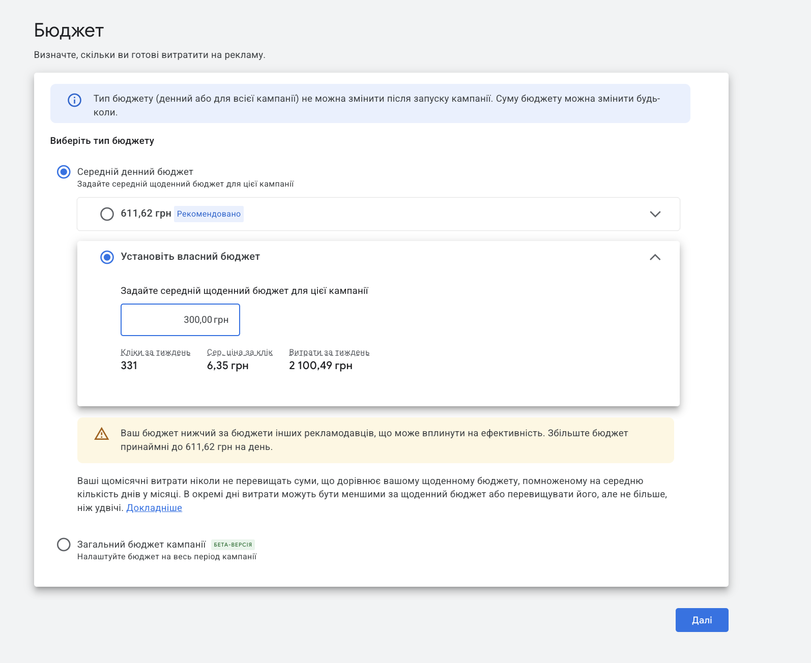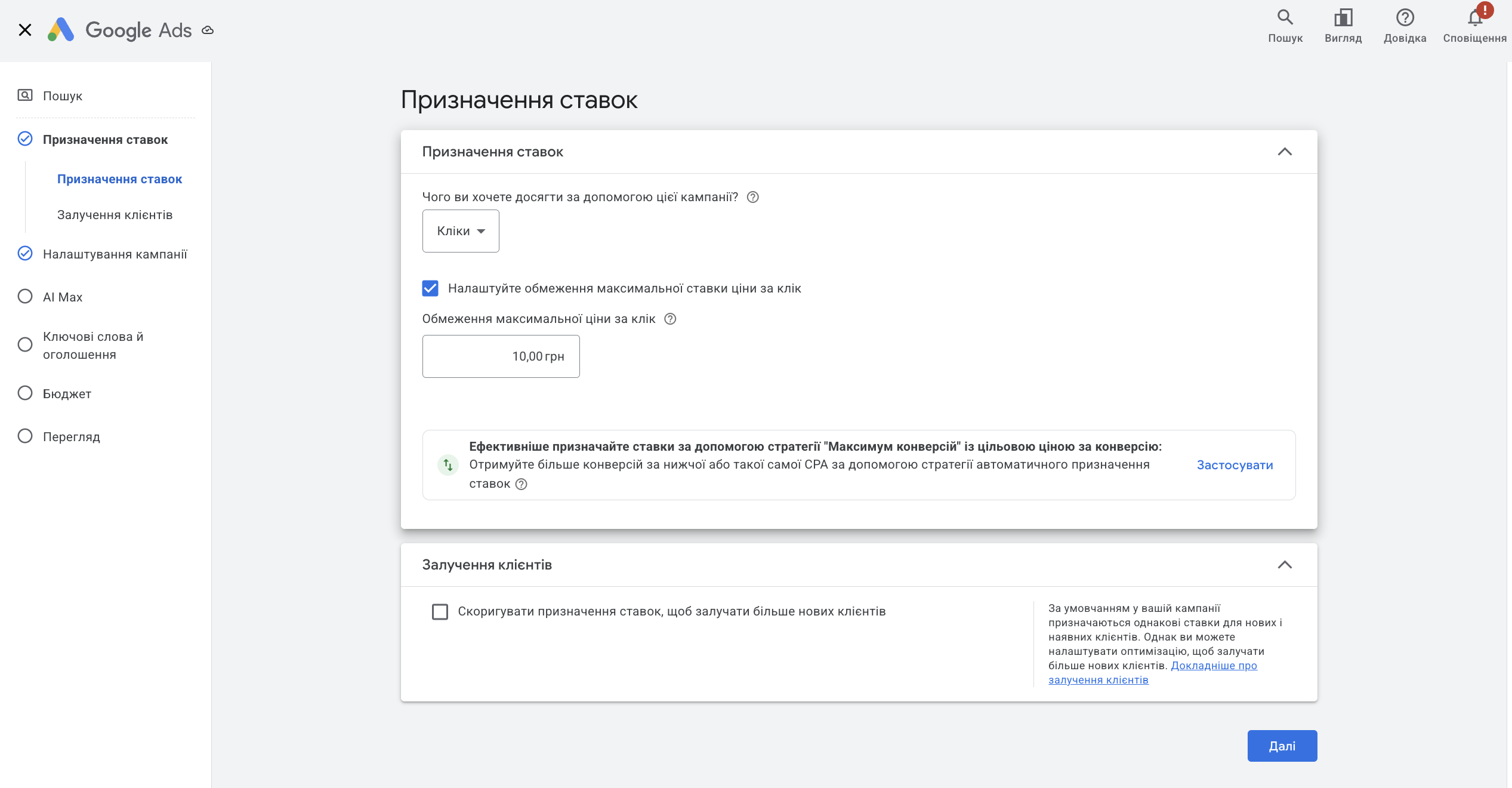 Почнімо зі стратегії Призначення ставок. Google пропонуватиме автоматичні стратегії -“Максимум конверсій”. Але для нового акаунту, де ще немає історії продажів, краще обрати “Максимальна кількість кліків” з обмеженням максимальної ціни за клік (наприклад, поставити ліміт 10 грн, щоб не купувати занадто дорогі переходи). Це дозволить отримати максимум трафіку на сайт за ваш бюджет. Коли набереться статистика конверсій, можна буде перемкнутися на “розумні” стратегії.