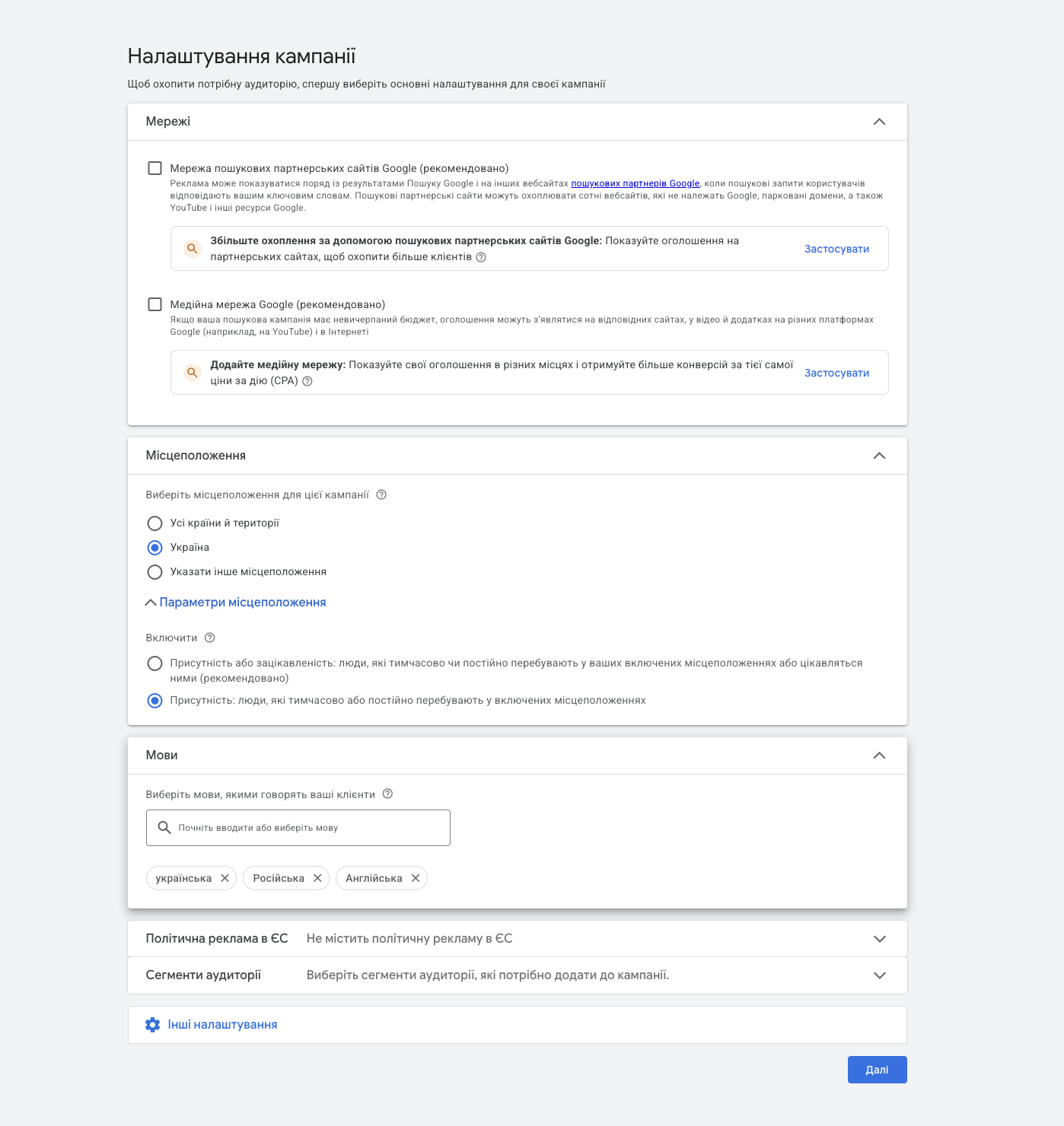 Уявімо, що для старту ми обрали Пошукову кампанію. Давайте пройдемо шлях налаштування, щоб ваша кампанія не з’їла бюджет за першу годину.