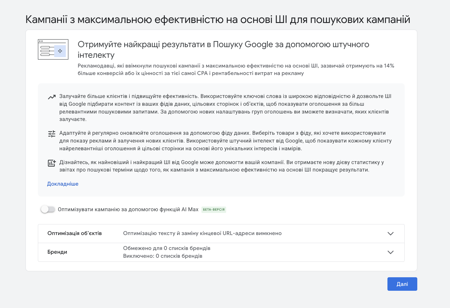 Функція AI Max. Кампанії з максимальною ефективністю на основі ШІ для пошукових кампаній