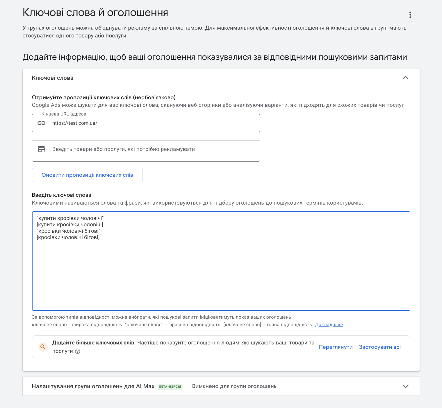 Увага на типах відповідності! Не додавайте слова просто так. Використовуйте фразову відповідність (слова в лапках: “купити кросівки чоловічі”) або точну (у квадратних дужках: [купити кросівки чоловічі]). Якщо ви додасте ключове слово в широкій відповідністі (без лапок та квадратних дужок), Google покаже вас і по запиту “як помити кросівки” або “фото кросівок”, і ви даремно витратите гроші.
