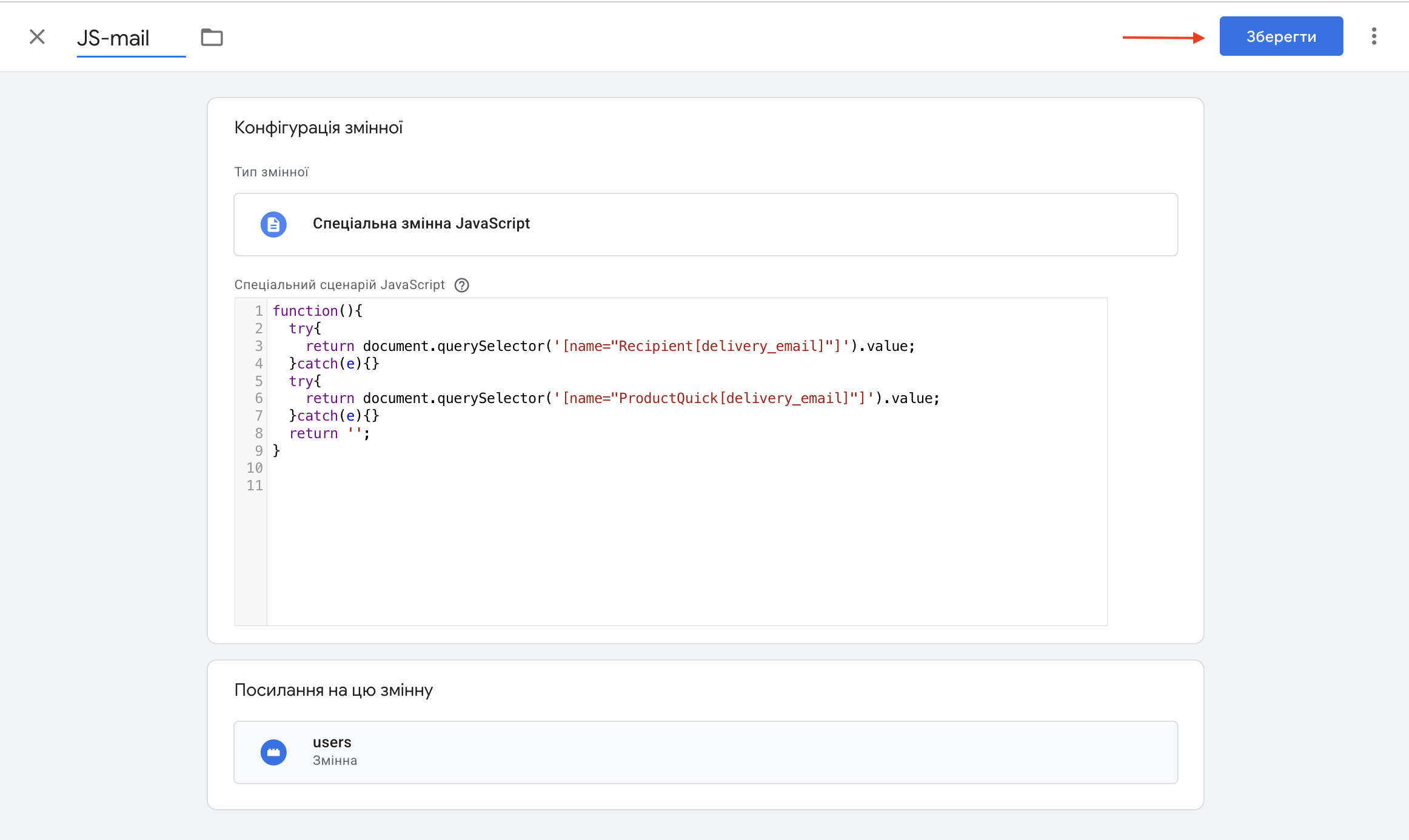 Називаємо змінну JS-mail та натискаємо зберегти.