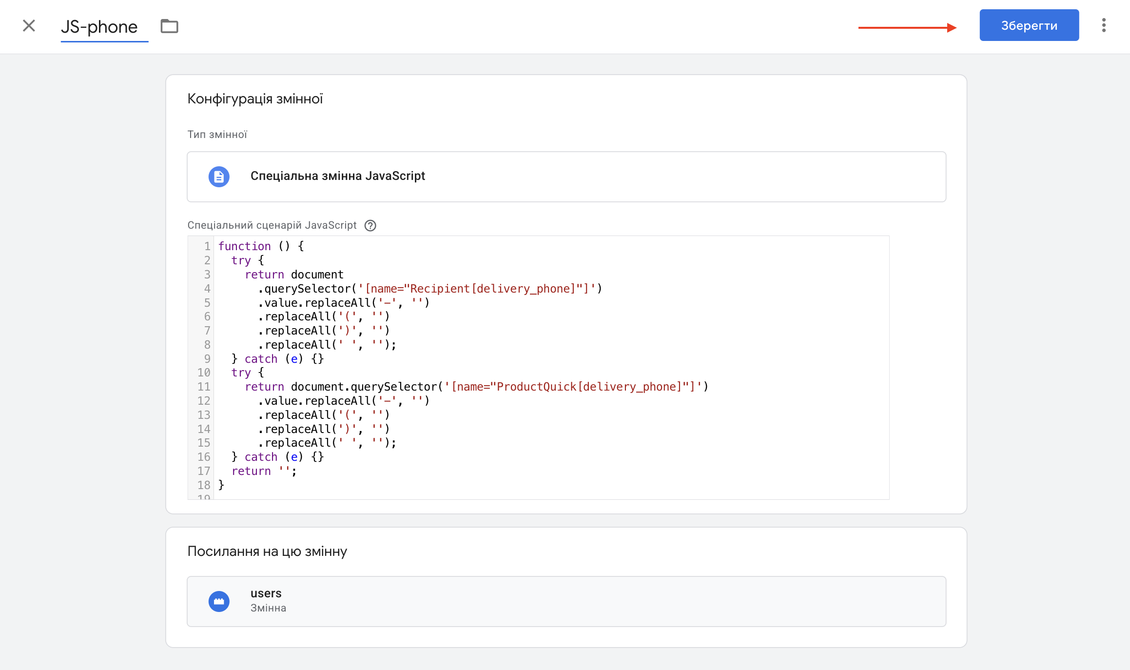 Називаємо змінну JS-phone та натискаємо зберегти. Даний скрипт не лише вказує на параметр, який необхідно відстежити, а й змінює формат номеру телефону відповідно до вимог Google.