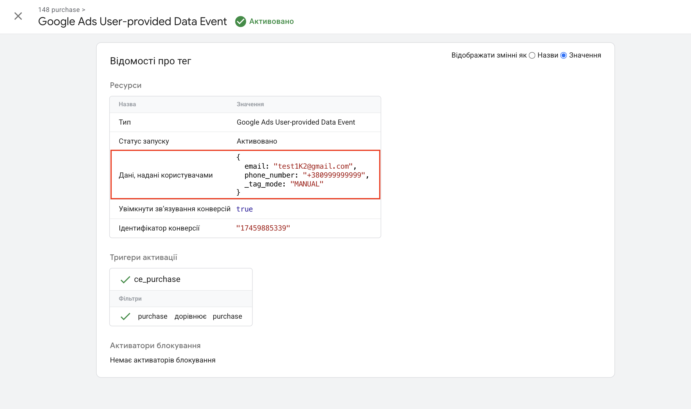 Як бачимо на скріні вище, завдяки виконаним налаштуванням, тег Google Ads User-provided Data містить: