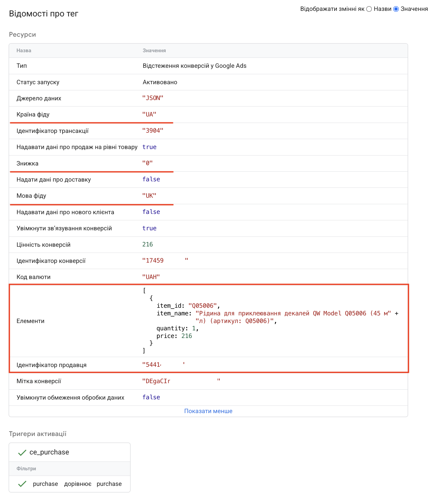 Відкриваємо його та клікаємо в полі “Конфігурація тегу”, щоб активувати налаштування. Ми вже зазначили ідентифікатор та мітку конверсії, налаштували передачу цінності, ідентифікатору трансакції та валюти.